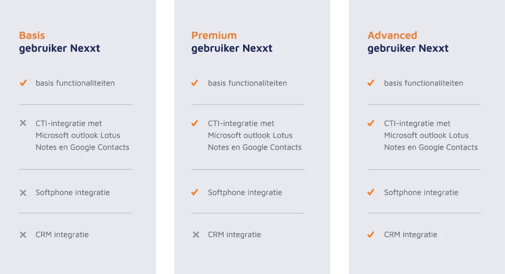 Onze dienstverlening begint al vanaf 2 gebruikers en biedt alle functionaliteiten die u nodig heeft. U kunt kiezen uit drie verschillende pakketten: Basis, Premium en Advanced Nexxt. Bij Premium krijgt u extra’s zoals softphone integratie en CTI integratie, terwijl u bij Advanced ook gebruik kunt maken van CRM integratie. Of u nu kiest voor Basis, Premium of Advanced, u kunt erop vertrouwen dat wij u de beste service bieden. Met Hosted Nexxt kunt u zorgeloos werken en heeft u alles in huis om uw klanten optimaal te bedienen.